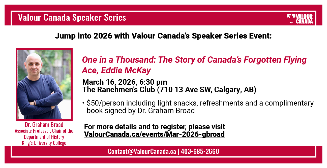 Valour Canada invites you to attend our Speaker Series event featuring an engaging talk by Dr. Graham Broad, Associate Professor and Chair of the Department of History at King’s University College. An active scholar in war and society studies, Dr. Broad’s presentation will explore the courage and the legacy of a remarkable but often overlooked First World War pilot – Eddie McKay.