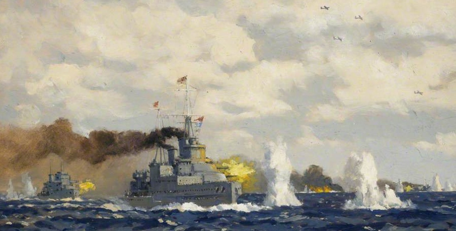 Artistical rendition of the Battle of the Bay of Biscay. The action depicted is the battle between HMS ‘Glasgow’ (1936) and HMS ‘Enterprise’ (1927) and a group of German destroyers. (Credit: Norman Wilkinson – Royal Museums Greenwich via Wikipedia)